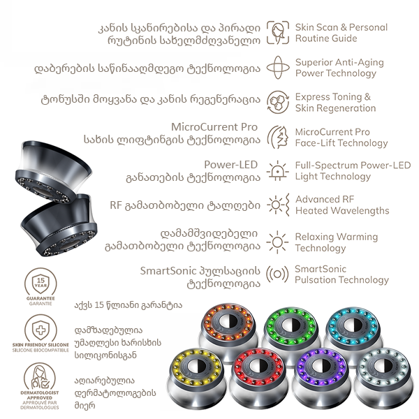 ჭკვიანი, აპლიკაციით მართვადი ანტიასაკობრივი, კანის გამაახლებელი მოწყობილობა, მასში მოთავსებული 9 ინოვაციური ტექნოლოგიის მეშვეობით, შენს კანს უფრო გლუვს, ელასტიურს და მკვრივს გახდის.