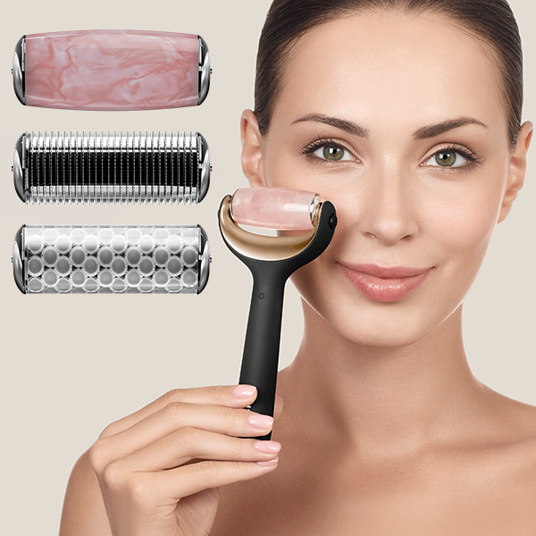 Our MicroNeedle Face & Body Roller | 9 in 1 comes with three easily exchangeable attachments: Microneedle, Cooling, and Rose Quartz Heads.