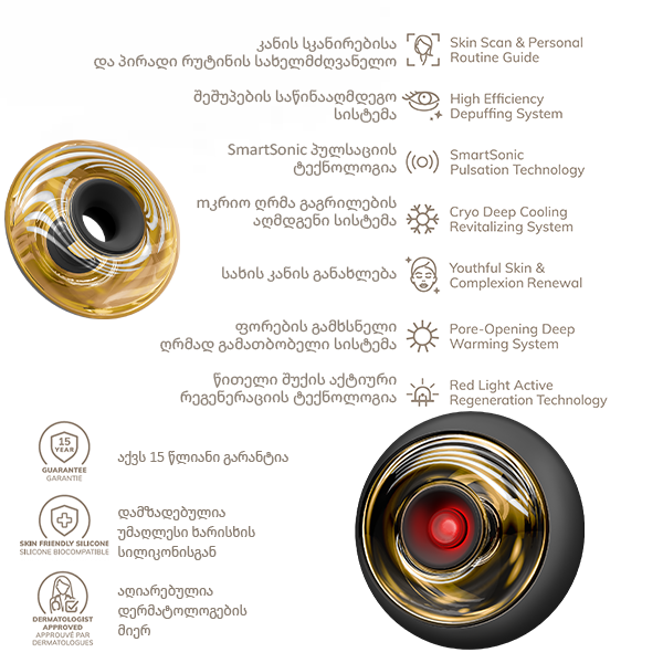 გამოსცადეთ ფორების გახსნის ღრმა გათბობის სისტემის უპირატესობები, როგორიცაა მომადუნებელი ეფექტი, სისხლის მიმოქცევის გაუმჯობესება,საკვები ნივტიერებების უკეტესი შეწოვა და ლიმპის ნაკადის სტიმულაცია.მაღალეფექტური შეშუპების საწინააგმდეგო სისტემა და კრიო ღრმა გაგრილების აღმდგენი სისტემა აგრილებს კანს, ავიწროებს სისხლძარღვებს დააქრობს შეშუპებას. Red Ligh აქტიური რეგენერაციის ტექნოლოგია ამცირებს დაბერების ნიშნების გაჩენას და აჩქარებს კანის განახლების პროცესს. Experience the benefits of the Pore-Opening Deep Warming System, which promotes relaxation, improves blood circulation, enhances nutrient absorption, and stimulates lymph flow. The High Efficiency Depuffing System and the Cryo Deep Cooling Revitalizing System gently cool the skin, constricts blood vessels and tackle puffiness, thereby reducing swelling. Thanks to the Red Light Active Regeneration Technology, you can instantly reverse signs of ageing and accelerate your skin’s renewal processes.